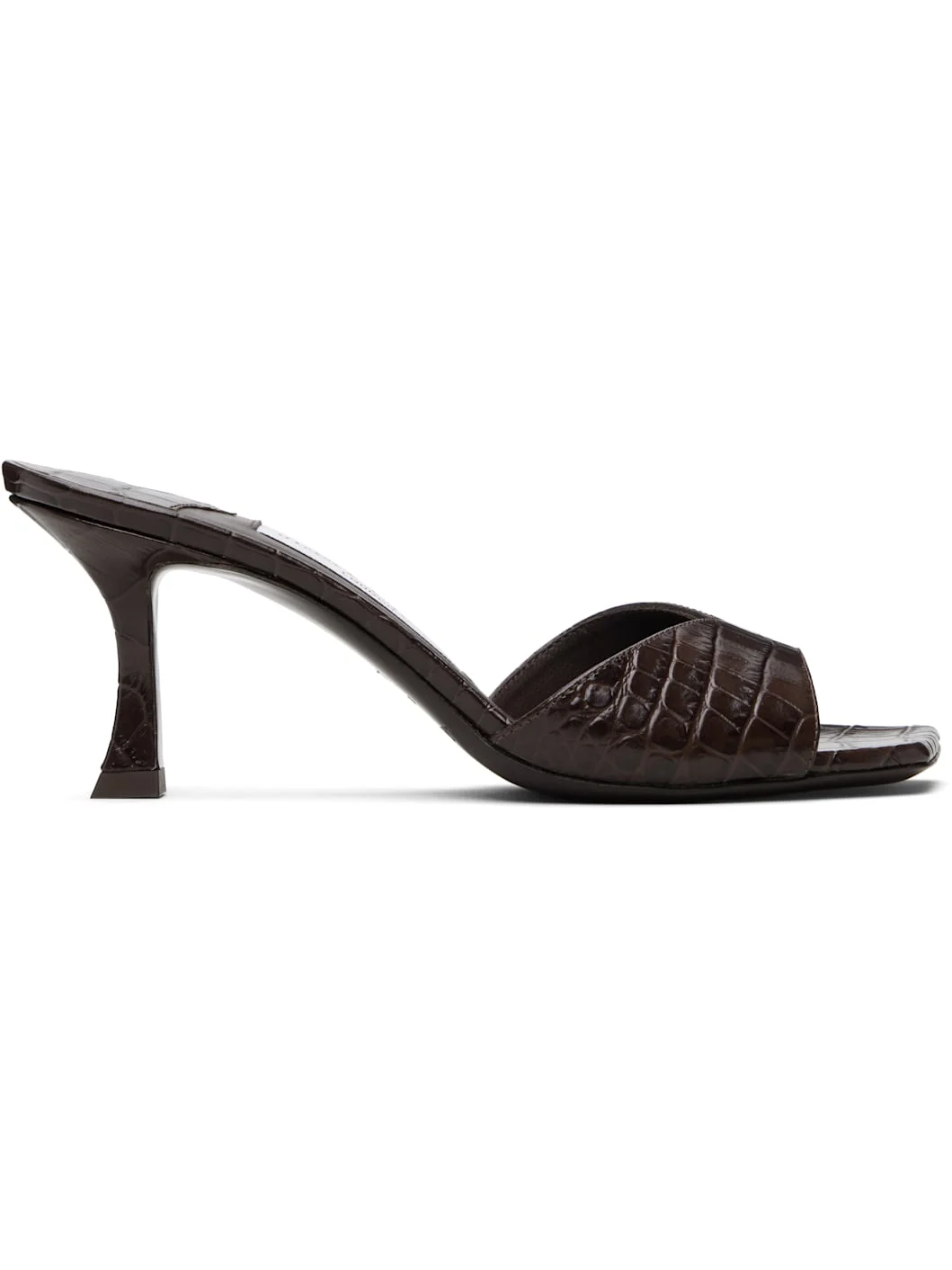 Croc-embossed leather slip-on heeled sandals. · Open square toe · Logo patch at padded footbed · Grained leather lining · Covered kitten heel with rubber injection · Leather sole · Heel: H2.75" Supplier color: Chocolate Upper: leather. Sole: leather. Made in Italy 261528F125015