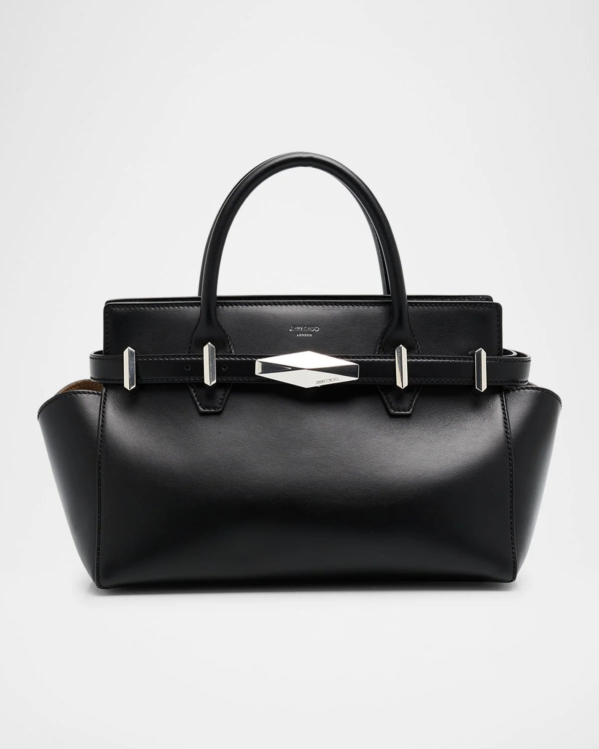 Jimmy Choo top handle bag in leather and brass Rolled top handles Zip to closure Exterior, adjustable diamondshaped belted strap front Interior, one slip pocket Lining: Leather Approx. 7.9"H x 5.5"W x 1.2"D Made in Italy