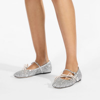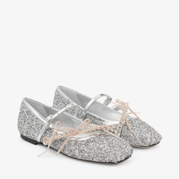 Details, Care & Fit A playful take on the classic ballerina flat, the Loli is presented in powder glitter and contrasting leather and satin trims. The silhouette is defined by double straps and a squared toe reminiscent of pointe shoes, embellished with crystals accents and satin bows. - Powder glitter fabric - Contrast trims - Double straps - Crystal embellishment - Satin bows - Made in Italy