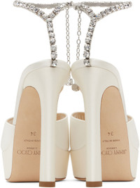 Satin heeled sandals in off-white. · Open square toe · Crystal-cut detailing and charm at hook-eye ankle strap · Buffed leather lining · Logo patch at leather footbed · Covered platform midsole and stiletto heel · Nubuck sole · Platform: H1.25" · Heel: H4.75" Available exclusively at SSENSE. Supplier color: Ivory/Crystal Upper: textile. Sole: leather. Made in Italy 251528F125046