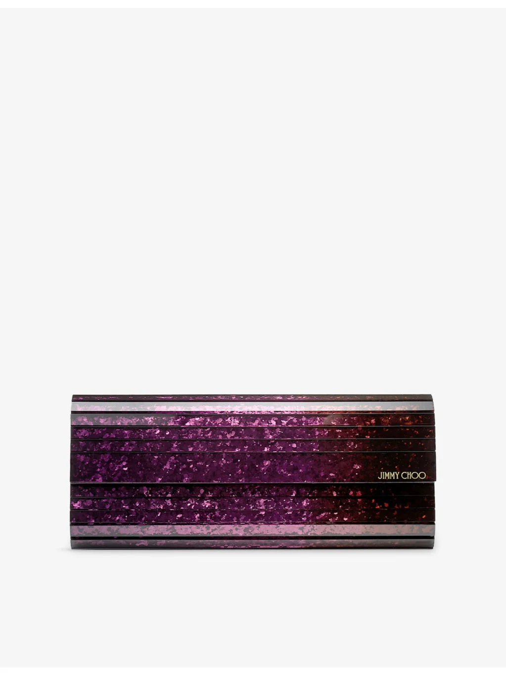 PRODUCT DETAILS - Jimmy Choo acrylic clutch bag - 75% plexy, 15% lamb leather, 10% brass - Flap-over with magnetic closure - Rectangular shape, chain shoulder strap, logo script at front, one main compartment, glittered finish - Height 10cm, width 5cm, depth 24cm, strap drop 44cm - Wipe with a clean, dry cloth - Made in Italy Ref: R04549884