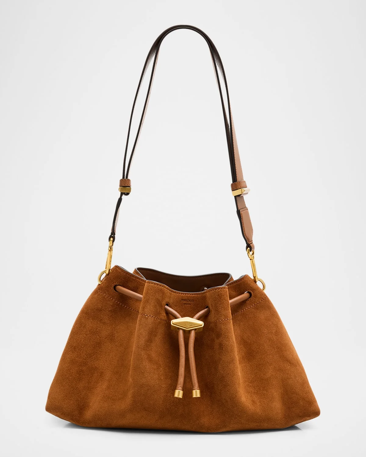 Jimmy Choo shoulder bag in suede, leather, and brass Detachable shoulder strap Drawstring closure Interior, one zip pocket Approx. 6.2"H x 13.7"W x 5.1"D Item Weight (Lbs.): 0.5 Made in Italy