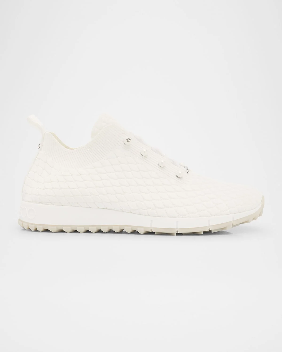 - Jimmy Choo "Veles" stretch cotton diamond-knit trainer sneakers with pearly stud eyelets - Flat heel - Round toe - Lace-up vamp - Rubber outsole - Imported