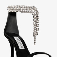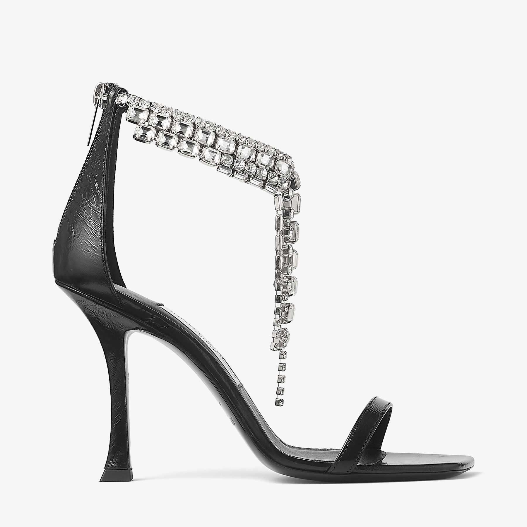 Details, Care & Fit Adorned with cascading crystals at the ankle, the Verity sandal is a statement design in vintage metallic leather. This style is designed with a square toe and sculpted heel. - Vintage metallic leather - Crystal ankle strap - Square toe - Back zip - Curved heel - Leather and rubber sole - Heel height measures: 100mm/3.9 inches - Made in Italy