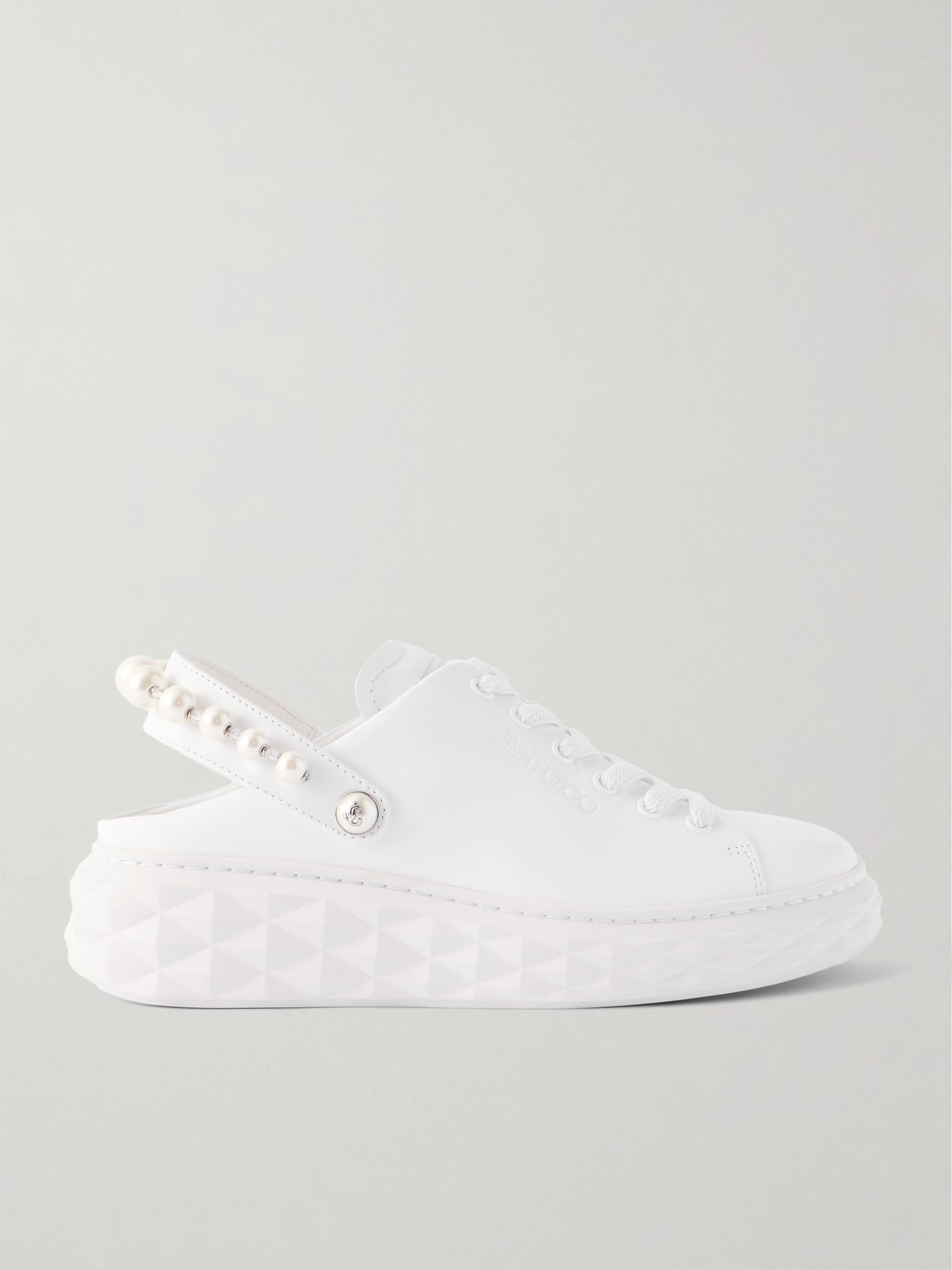 Jimmy Choo's slip-on sneakers are designed with slingback straps decorated with faux pearls. They're made from leather and have stamped logos and chunky rubber soles that feature the brand's signature diamond pattern. Details & Care - Rubber sole measures approximately 40mm/ 1.5 inches - White leather (Lamb) - Slingback strap