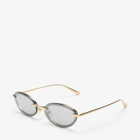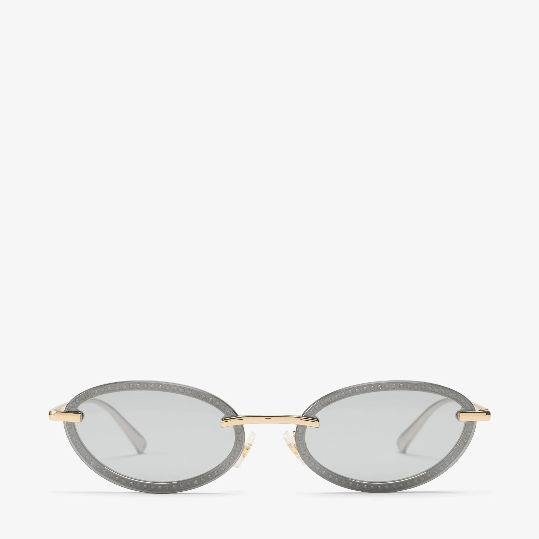 Details, Care & Fit The Zina sunglasses reimagine the classic oval silhouette with a slender pale gold metal frame and mirrored silver lenses. A halo of delicate crystals traces the outer rim, and feature in the 'O's of Jimmy Choo. - Acetate containing 27% recycled content - Bio-nylon lenses - Grey shaded mirrored lenses - Oval frame - Jimmy Choo logo - Mini crystal-embellishment - 100% UVA and UVB protection - Presented with a Jimmy Choo case and cleaning pouch - Lens width: 5.9cm - Bridge length: 1.6cm - Temple length: 14cm - Made in Italy