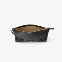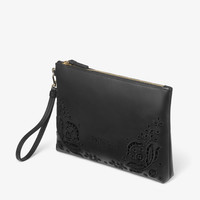 Details, Care & Fit A refined essential for your daily capsule - whether you’re in the city or the sun. This beautiful pouch is a small, structured silhouette accented with a wrist strap, making it an effortless on-the-go style. Crafted in supple leather adorned with intricate Sangallo embroidery, it combines ease with delicate glamour. Accented with a leather strap and finished with an embossed Jimmy Choo logo, this pouch makes for an elegant icon. - Leather - Sangallo embroidery - Leather wrist strap - Jimmy Choo logo - Bag Measurements: L 25.5 x H 17.5 x W 4cm - Handle drop: 4cm - Shoulder strap drop: 14cm - Made in Spain - By purchasing this product, you join our commitment to support responsible leather manufacturing through the Leather Working Group