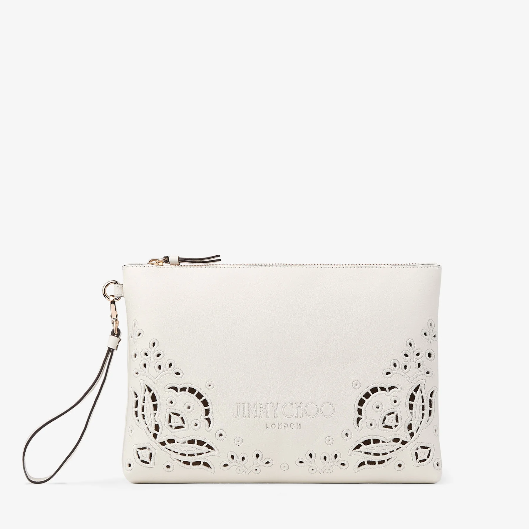 Details, Care & Fit A refined essential for your daily capsule - whether you’re in the city or the sun. This beautiful pouch is a small, structured silhouette accented with a wrist strap, making it an effortless on-the-go style. Crafted in supple leather adorned with intricate Sangallo embroidery, it combines ease with delicate glamour. Accented with a leather strap and finished with an embossed Jimmy Choo logo, this pouch makes for an elegant icon. - Leather - Sangallo embroidery - Leather wrist strap - Jimmy Choo logo - Bag Measurements: L 25.5 x H 17.5 x W 4cm - Handle drop: 4cm - Shoulder strap drop: 14cm - Made in Spain - By purchasing this product, you join our commitment to support responsible leather manufacturing through the Leather Working Group