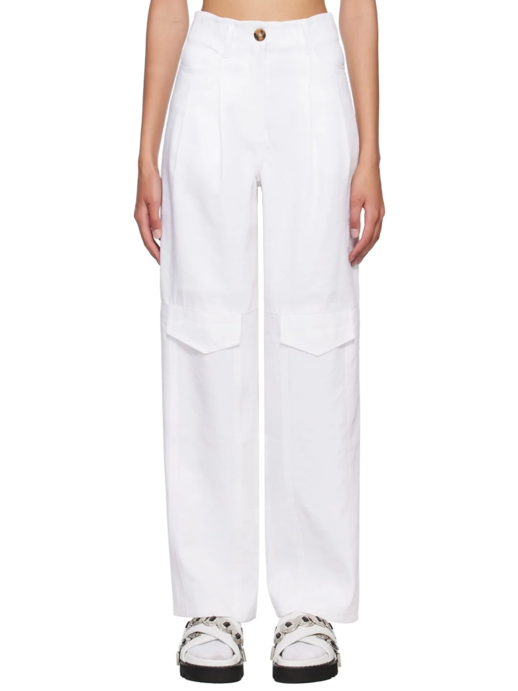 Linen-blend twill trousers. · Belt loops · Five-pocket styling · Zip-fly · Pleats at front waistband · Flap pocket at knees · Partial satin lining Supplier color: White Body: 75% linen, 25% polyester. Lining: 100% polyester. Made in South Korea 231789F069001