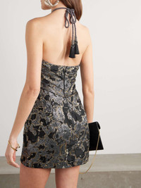 Johanna Ortiz describes its 'Distinguished Avardians' mini dress as a "must-have" for nights out. Made at the brand's atelier in Cali, Colombia by local artisans, it's cut from silk-jacquard for a figure-hugging fit and embroidered with metallic threads around the shimmering sequins. The knotted front is held in place by halterneck ties and detailed with a keyhole cutout. This product was Locally Made and supports Craft and Community. Find out more about NET SUSTAIN here. Size & Fit - Fits true to size, however those who are between sizes should take the smaller size - Designed for a slim fit - Mid-weight, heavily embellished, non-stretchy fabric - Model is 177cm/ 5'10" and is wearing a US 2 Details & Care - Black, silver and gold sequined silk-jacquard - Ties at neck, concealed hook and zip fastening at back - 100% silk - Green dry clean