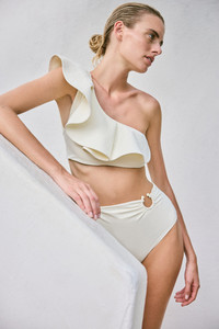 A striking one-shoulder bikini top in ecru, featuring a sculptural bolero-style design—a classic Johanna Ortiz style. This piece can be paired with its matching bikini bottom or styled with other prints from the collection for a versatile, mix-and-match look. Size and Fit: Designed for a slim fit. Please refer to our size chart for detailed measurements and guidance. Product Details: Closure: Tie At Back Composition: 78% Recycled Polyamide, 22% Elastane Fabrication: Lycra Color: Ecru Made in Colombia