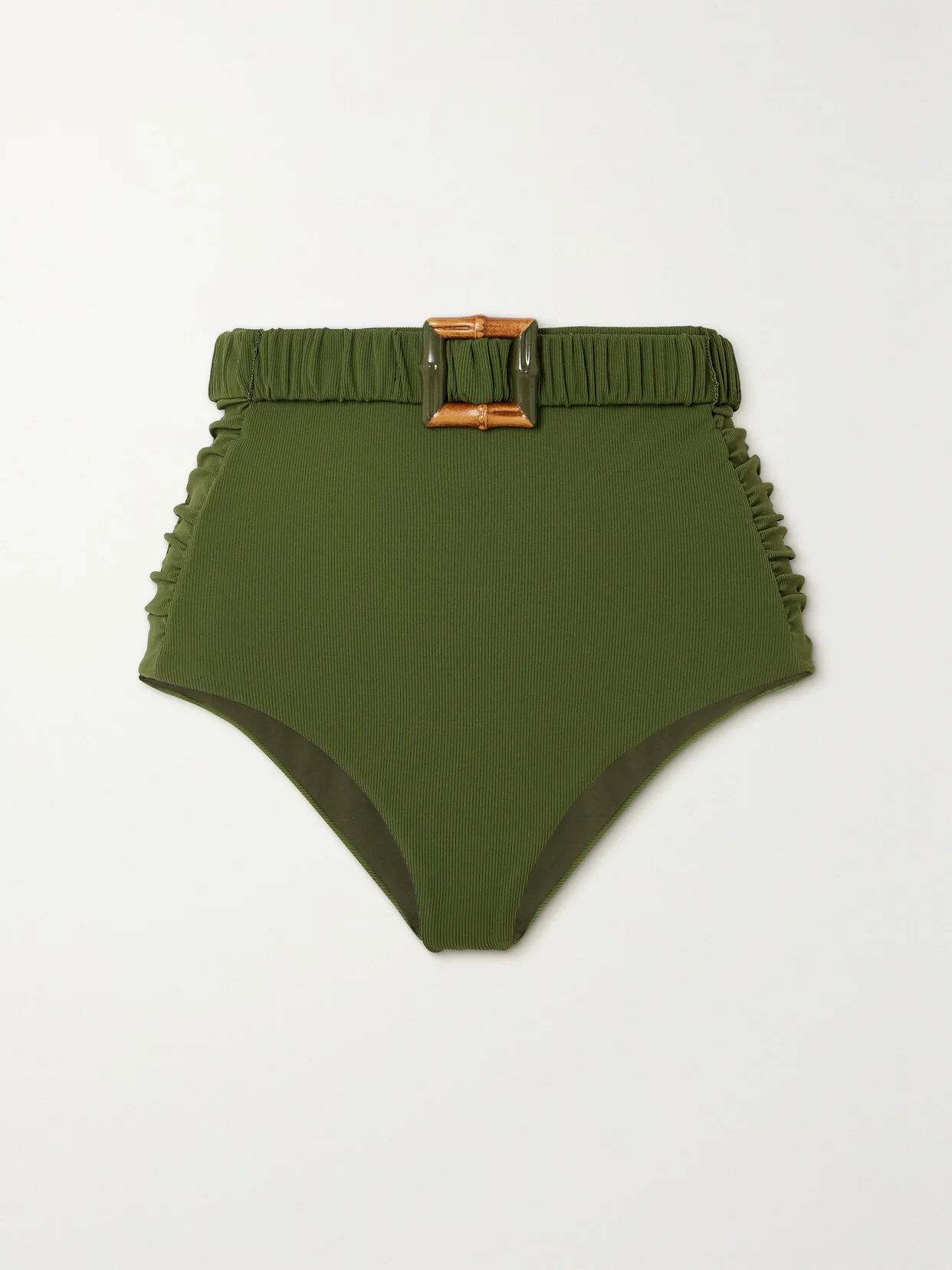Johanna Ortiz's 'Orinka' bikini briefs have been made in the label's Colombian atelier, which provides educational and medical programs for its artisans. They have ruched sides and a removable waist belt for a customizable fit. Style yours with the coordinating top and gold accessories. This product was Locally Made and supports Craft and Community. Find out more about NET SUSTAIN here.