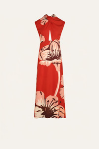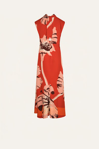 Sleeveless midi dress in structured heavy crepe with a bold floral placement print. Designed with a gently gathered neckline that adds shape through the shoulders and creates subtle movement through the body. Style it with minimal sandals and sculptural accessories to echo its clean lines and graphic flow. Size and Fit: - True to size. - Please refer to our size chart for detailed guidance. Product Details: Closure: Back Zipper Composition: 95% Viscose, 5% Elastane Fabrication: Heavy Crepe Color: Red/Light Pink/Wine/Ecru Made in Colombia Dimensions: Length 36.22''
