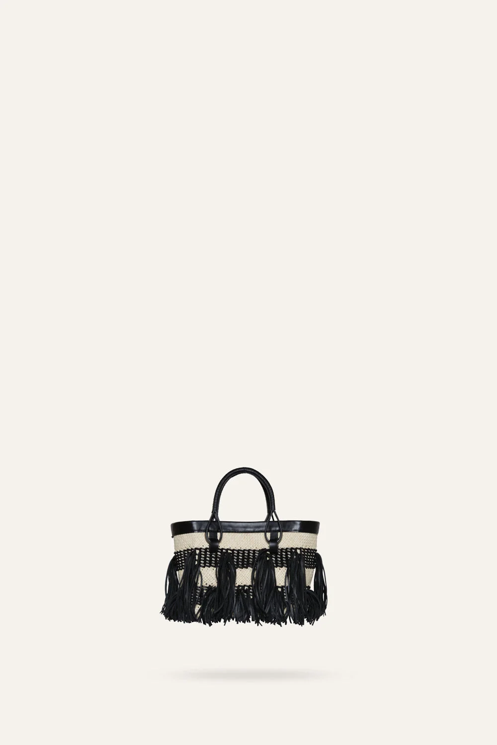 A structured mini tote crafted from Iraca palm, featuring intricate woven details and fringe accents. A perfect balance of different textures, it effortlessly transitions from day to night with understated elegance. Product Details: Closure: Open Top Composition: 85% Natural Fiber (Iraca Palm), 15% Cow Leather Fabrication: Natural Fiber (Iraca Palm) Leather Tote Bag Color: Ecru/Midnight Black Made in Colombia