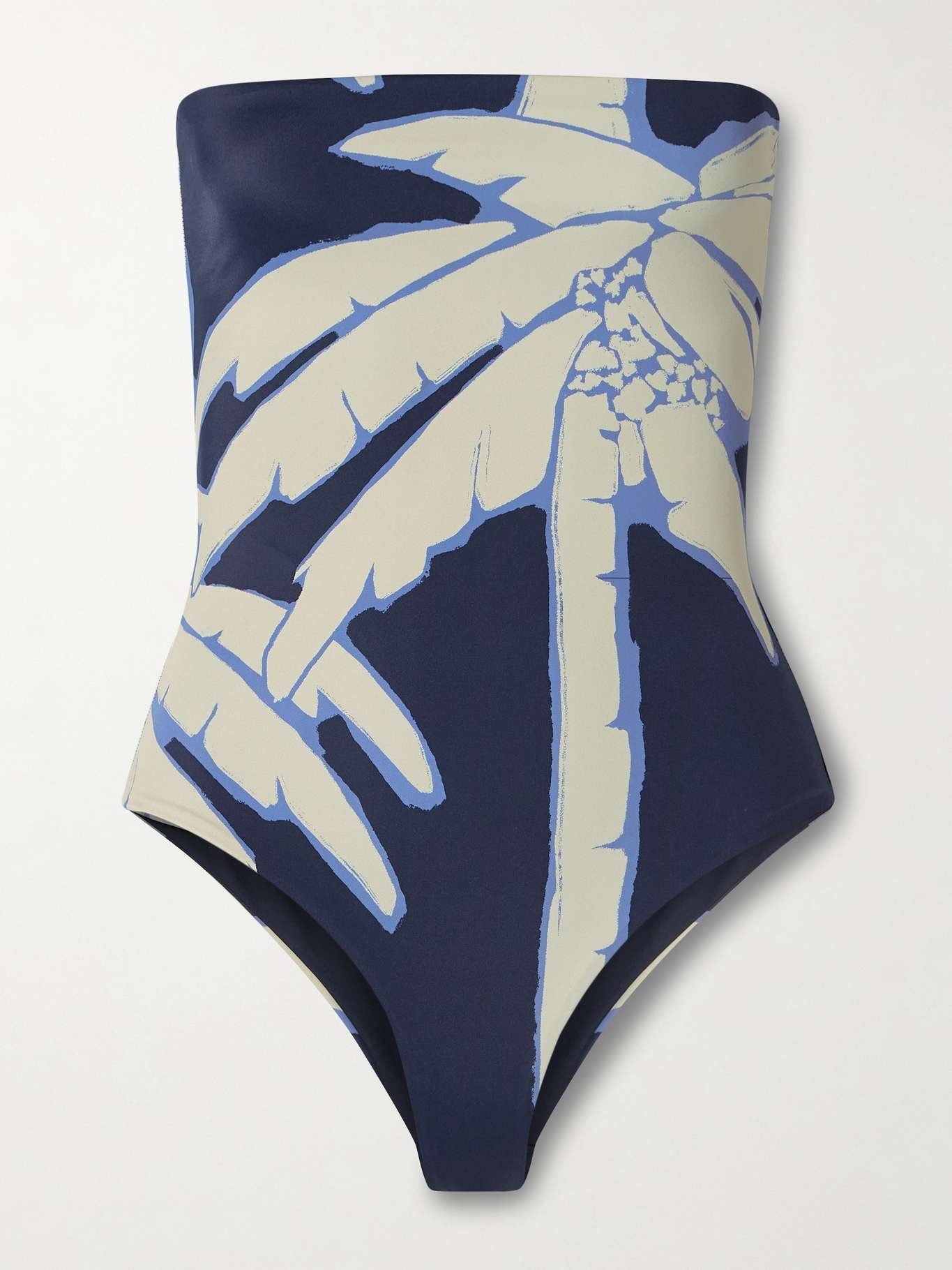 Johanna Ortiz's tropical motifs are inspired by the nature of Cali, Colombia, where the founder has roots. This 'Alta Mar' swimsuit is made from smoothing stretch fabric printed with palm trees and has a strapless neckline and minimal brief coverage. Lower-Impact Materials. This product is made using at least 50% lower-impact materials or ingredients. Find out more about our NET SUSTAIN criteria here. Size & Fit - Fits true to size, take your normal size - Minimal brief coverage - Model is 177cm/ 5'10", bra size 32B and is wearing a size XSmall Model measurements: - Bust: 81cm/ 32" - Waist: 61cm/ 24” - Hip: 81cm/ 32" Details & Care - Tonal-blue and ecru stretch-polyamide - Pulls on - 78% polyamide, 22% elastane - Hand wash or green dry clean - Lotion, sunscreen, oil and chlorine can cause discoloration of this item; this is not a manufacturing defect. Please follow care instructions to keep your swimwear in the best condition