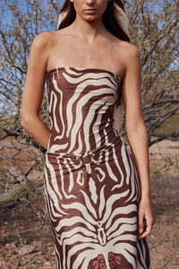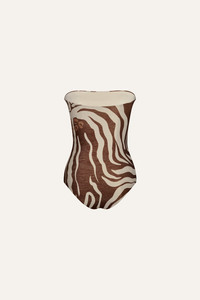 A timeless Johanna Ortiz silhouette with a strapless design. Effortlessly pairs with the matching skirt or mix-and-match pieces from the collection for a versatile resort look. Size and Fit: - Runs small based on customer feedback; consider sizing up for the best fit. - Please refer to our size chart for detailed guidance. Product Details: Closure: Slip On Composition: 67% Polyester, 21% Polyamide, 12% Elastane Fabrication: Shimmering Lycra Color: Mocca/Ecru Made in Colombia