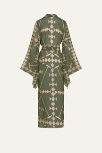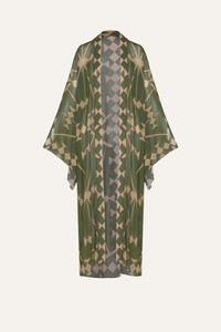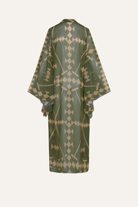A flowing kimono in eco-friendly georgette, featuring a striking green and ecru print. Wide sleeves and a belted waist create an effortless silhouette. V-neckline and sash for a customizable fit, perfect for layering over swimwear or styling as a statement piece. Size and Fit: - Runs large based on customer feedback; consider sizing down for the best fit. - Please refer to our size chart for detailed guidance. Product Details: Closure: Tie At Front Composition: 100% Recycled Polyester Fabrication: Eco Georgette Color: Green/Ecru Made in Colombia Dimensions: Length 39.4''