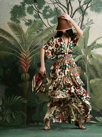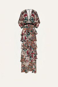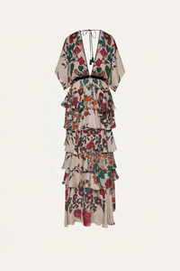 A maxi dress crafted in silk double georgette, featuring cascading tiers that create a layered silhouette. The botanical print unfolds in rich tones over an ecru base, adding depth and contrast. Designed for statement moments, it’s best styled with minimal accessories to let the print and volume take center stage. Size and Fit: - True to size. Please refer to our size chart for detailed guidance. Product Details: Closure: Back Zipper Composition: 100% Silk Fabrication: Silk Double Georgette Color: Ecru/Red/Green Made in Colombia Dimensions: Length 45.28''
