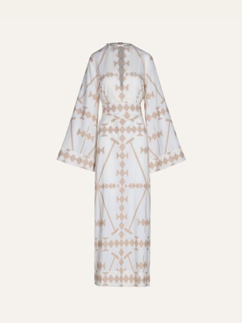 A strapless linen ankle-length dress featuring a bold geometric pattern. Designed with a wrap-effect silhouette and a side slit. Size and Fit: - Runs small on the bust based on customer feedback. - Please refer to our size chart for detailed guidance. Product Details: Closure: Slip On Composition: 100% Linen Fabrication: Light Linen Color: Paprika/Pink Made in Colombia Dimensions: Length 37.4''