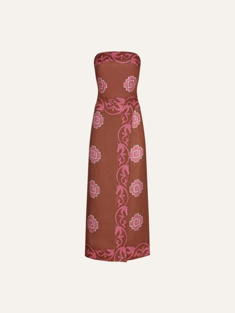 A strapless linen ankle-length dress featuring a bold geometric pattern. Designed with a wrap-effect silhouette and a side slit. Size and Fit: - Runs small on the bust based on customer feedback. - Please refer to our size chart for detailed guidance. Product Details: Closure: Slip On Composition: 100% Linen Fabrication: Light Linen Color: Ecru/Black Made in Colombia Dimensions: Length 37.4''