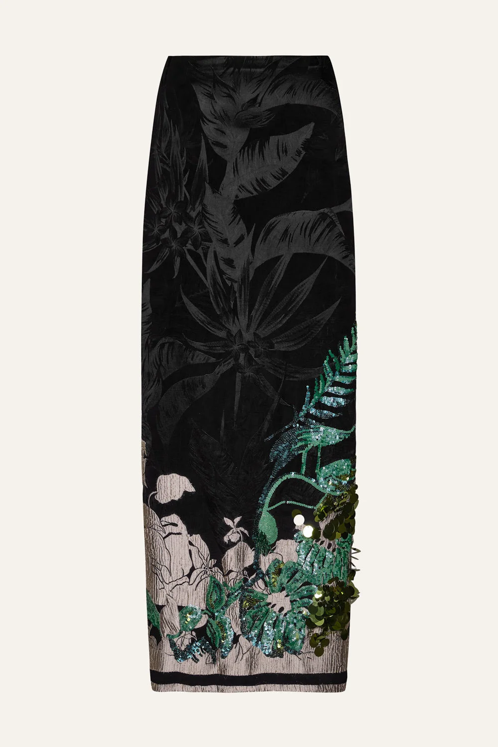 A jacquard maxi skirt with a high-rise, A-line silhouette, adorned with intricate embroidery and sequins. A versatile statement piece for elevated styling. Size and Fit: Slim fit. High-rise, A-line silhouette. Please refer to our size chart for detailed guidance. Product Details: Closure: Back Zipper Composition: 81% Viscose, 19% Acetate Fabrication: Jacquard Color: Black/Ecru Made in Colombia