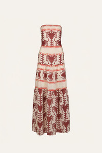 A strapless maxi dress cut in light linen. Defined by its tiered silhouette in ecru and marsala. The artisanal motifs and easy drape make it a versatile piece for warm-weather occasions. Dress it up with statement jewelry from the collection. Size and Fit: True to size. Please refer to our size chart for detailed guidance. Product Details: Closure: Slip On Composition: 100% Linen Fabrication: Light Linen Color: Ecru/Marsala Made in Colombia Dimensions: Length 40.55''
