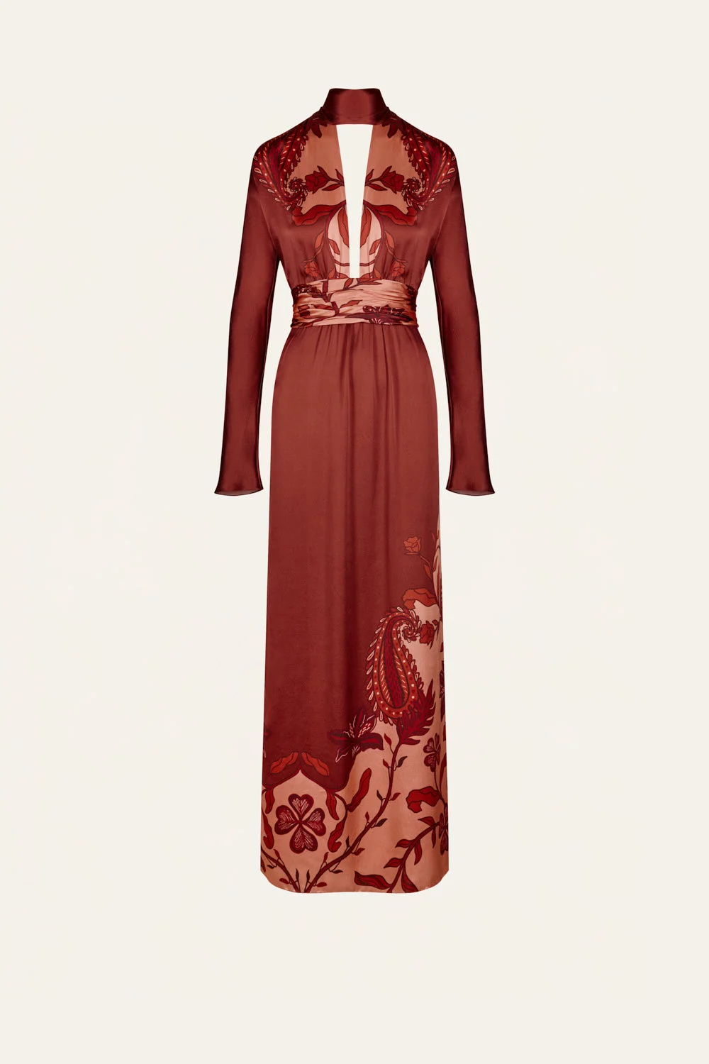 A long-sleeve dress in silk with a high neckline, front slit opening, and elongated cuffs. The tonal botanical motif and placed print add visual rhythm to the fluid silhouette. Wear with minimal heels and sculptural jewelry for evening. Size and Fit: True to size. Please refer to our size chart for detailed guidance. Product Details: Closure: Tie At Back Composition: 100% Silk Fabrication: Hammered Charmeuse Color: Marsala/Peach Made in Colombia Dimensions: Length 45.28''