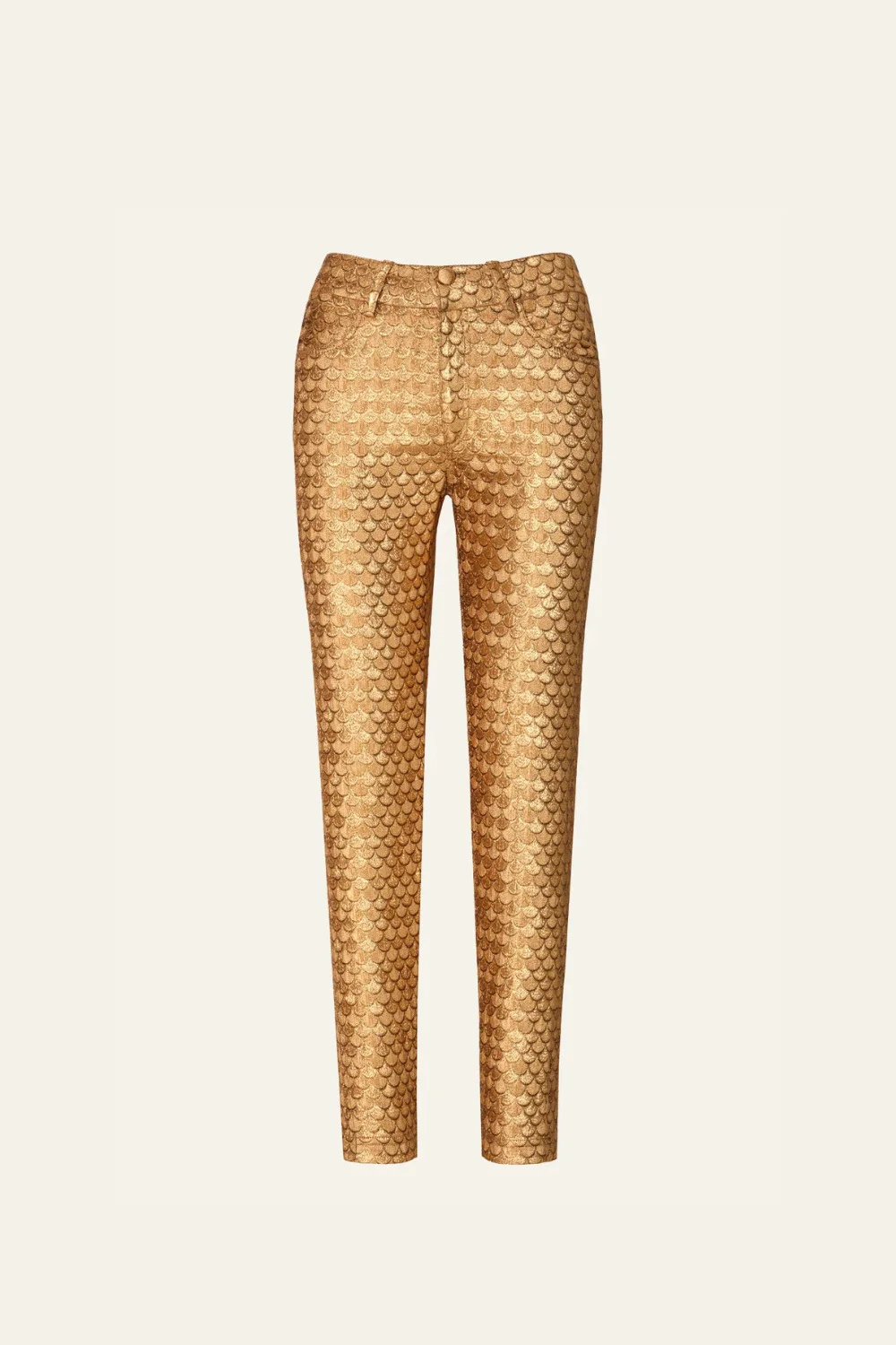 Tailored in gold jacquard, these pants feature a clean, structured silhouette with subtle shine. Wear them with the coordinating blazer for a polished look, or style them with a simple top to let the texture take focus. Size and Fit: True to size. High-rise, straight-leg. Designed for a slim fit. Please refer to our size chart for detailed guidance. Product Details: Closure: Front Buttons Composition: 45% Acrylic, 41% Cellulose Acetate, 14% Polyester Fabrication: Jacquard Color: Gold Made in Colombia