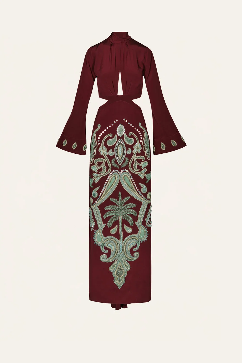 An evening dress in silk with intricate embroidery, feather-trimmed sleeves, and side cutouts. The high neckline and long sleeves offset the open elements. A classic Johanna Ortiz piece for special occasions. Size and Fit: True to size. Designed for a slim fit. Please refer to our size chart for detailed guidance. Product Details: Closure: Back Zipper Composition: 100% Silk Fabrication: Silk Cdc Color: Dark Violet/Green Made in India Dimensions: Length 45.28''