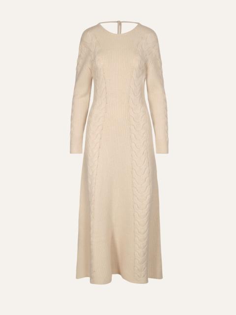 This knitted dress exudes elegance with its long, fitted silhouette. It features a striking cable-knit design that runs vertically, elongating the figure. The front offers a classic, high-neck look, while the back reveals a deep, open back with delicate ties that finish in playful tassels, adding a subtle yet bold touch of femininity. Size and Fit: Designed for a slim fit. Please consult our size chart for reference. Product Details: Composition: 100% Cashmere Fabrication: Cashmere Color: Ecru Made in China
