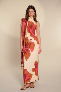 Heavy crepe ankle dress with a halter neckline, open back, and wide self-ties at the neck and waist. Printed with oversized floral motifs in warm, tropical tones. The fluid fabric and softly flared hem create movement with every step. Size and Fit: - Designed to fit true to size. - Please refer to our size chart for detailed guidance. Product Details: Closure: Back Zipper Composition: 95% Viscose, 5% Elastane Fabrication: Heavy Crepe Color: Ecru/Camel/Wine/Pink Made in Colombia Dimensions: Length 37.4''