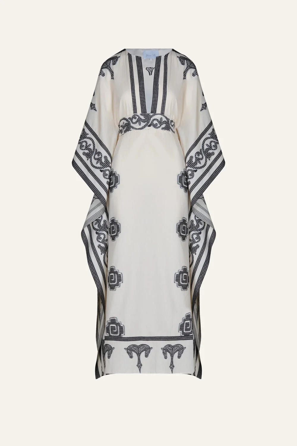 An effortless statement piece, this embroidered cotton kaftan features intricate detailing, wide sleeves, and a fluid silhouette. Designed for elevated ease, it transitions seamlessly from resort lounging to evening elegance. Comes with a sash for a customizable fit. Size and Fit: - Runs large based on customer feedback; consider sizing down for the best fit. - Please refer to our size chart for detailed guidance. Product Details: Closure: Slip On Composition: 100% Cotton Fabrication: Embroidered Cotton Color: Ecru/Black Made in Colombia Dimensions: Length 36.2''