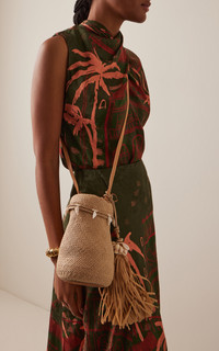 A sense of free-flowing abundance defines the Resort lineup from the Colombian designer, who calls the color palette for this collection “warm, moody, and unforgettable.” This ‘Bohemian Elegance’ shoulder bag incorporates elements of the label’s ‘Palm’s Embrace’ tote, namely its oversized decorative fringing. Alternatively, this style has an organic bucket frame, suspended from a neat leather strap. Use it at the beach to secure your smaller essentials. PRODUCT DETAILS - Open top - Composition: 80% natural fiber (iraca palm) 20% leather - Designer color: Ecru - Made in Colombia