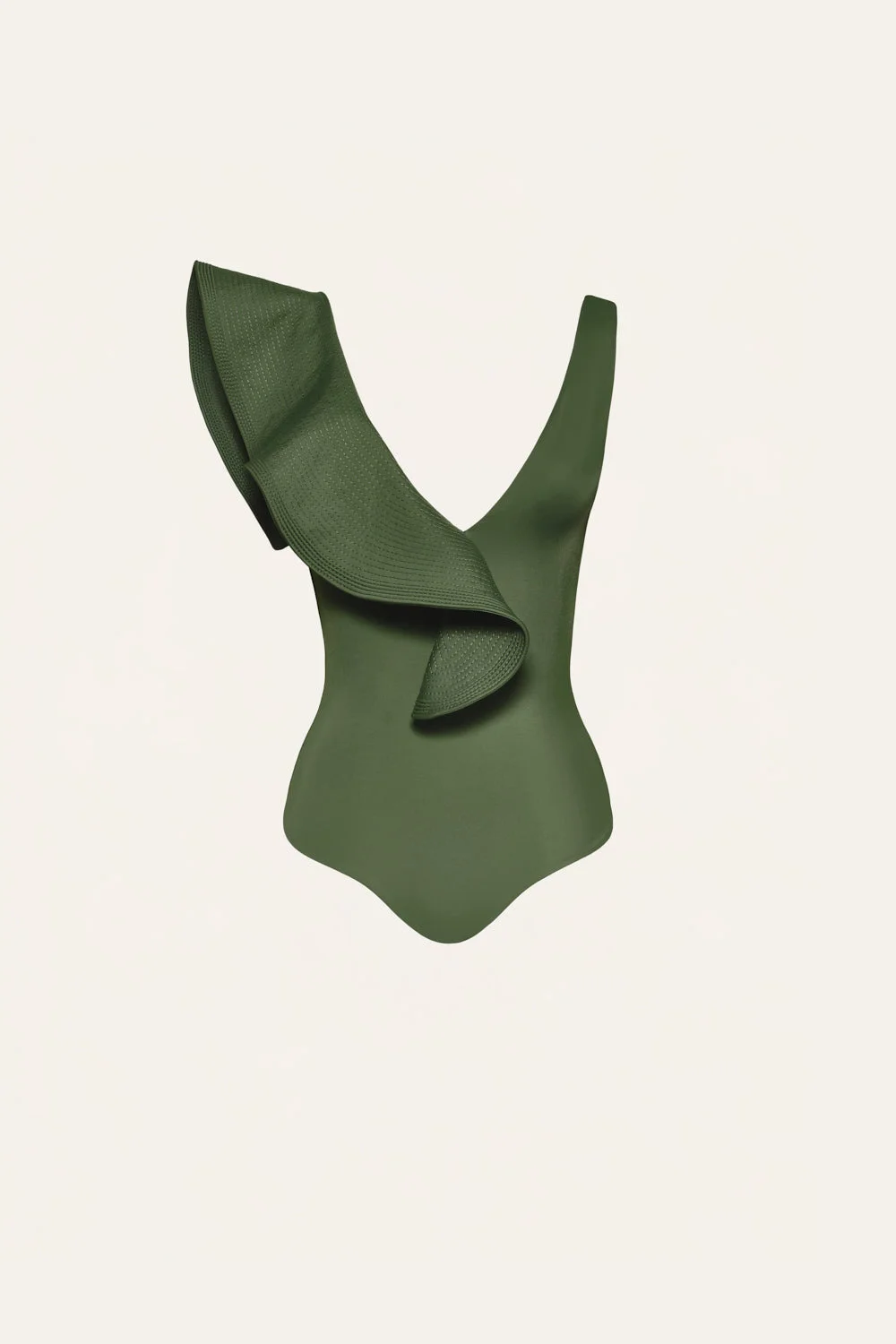Inspired by Johanna Ortiz’s iconic bolero detail, this one-piece swimsuit features a V-neckline with a dramatic ruffle. Designed for versatility, it transitions seamlessly from swimwear to a bodysuit, making it a timeless addition to any wardrobe. Size and Fit: True to size. Please refer to our size chart for detailed guidance. Product Details: Closure: Slip On Composition: 78% Recycled Polyamide, 22% Elastane Fabrication: Lycra Color: Light Green Made in Colombia