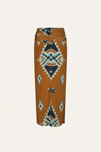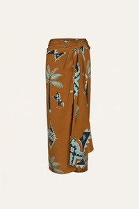 Silk wrap skirt with a knotted waist and fluid drape, designed in a bold, Western-inspired print. The asymmetrical hem adds movement, while soft pleats through the front create a flattering silhouette. Pair it with the matching shirt for a head-to-toe statement or style it with a simple knit. Size and Fit: - True to size. - High-rise. - Please refer to our size chart for detailed guidance. Product Details: Closure: Back Zipper Composition: 100% Silk Fabrication: Silk Cdc Color: Rust/Green/Mint Made in Colombia Dimensions: Length 37.4''