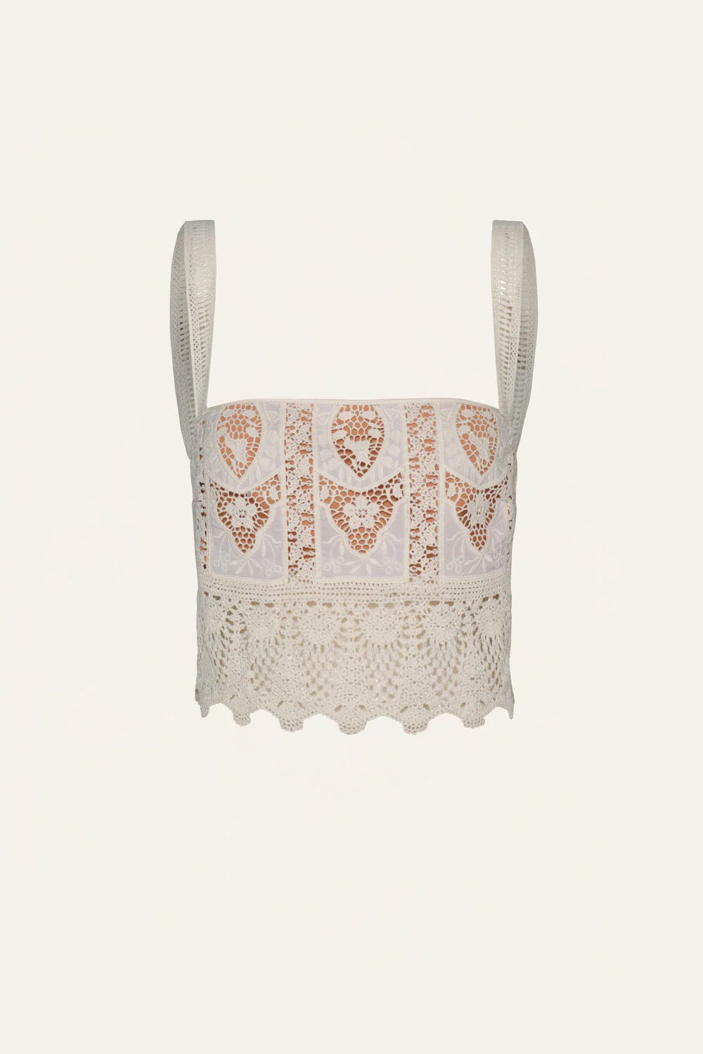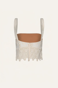 Square-neck cropped top crafted in embroidered voile, with wide straps and scalloped edging that adds a delicate finish. The intricate cutwork gives texture and lightness, ideal for warm weather styling. Pair it with the matching skirt for a coordinated look, or wear it with high-rise trousers to create contrast. Size and Fit: - Runs big based on customer feedback; consider sizing up for the best fit. - Boxy fit. - Please refer to our size chart for detailed guidance. Product Details: Closure: Back Button Composition: 100% Polyester Fabrication: Embroidered Voile Color: Ecru Made in Colombia