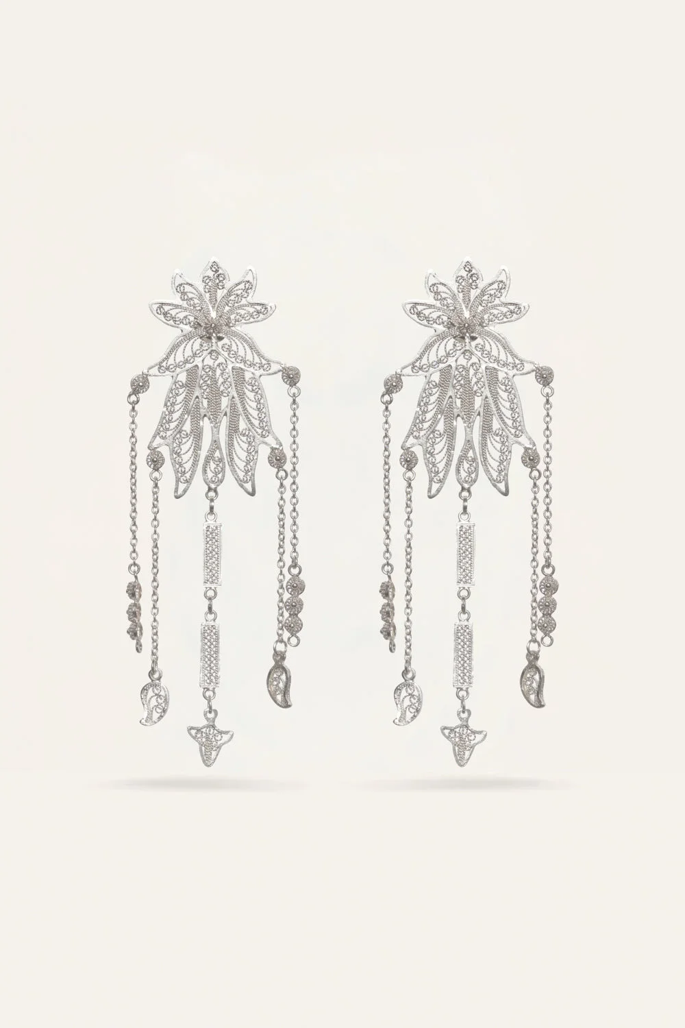 Hand-crafted in delicate filigree, these cascading earrings showcase intricate detailing and graceful movement — a refined expression of artisanal craftsmanship. Product Details: Closure: Post Fastening For Pierced Ears Composition: 100% Metal Brass Fabrication: Metal Brass Earring Color: Silver Made in Colombia Dimensions: Length 4.72'', Width 1.57''