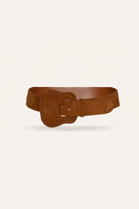 Crafted in rich suede, this wide belt features a sculptural buckle framed with tonal braided detailing. Its bold silhouette is designed to cinch the waist with texture and structure, adding a refined Western touch to dresses, skirts, or high-rise trousers. A timeless statement piece with artisanal flair. Product Details: Closure: Front Buckle Composition: 100% Cow Leather Fabrication: Leather Belt Color: Camel Made in Colombia Dimensions: Width: 1.89'', Buckle: Length: 4.53'', Height: 4.53''
