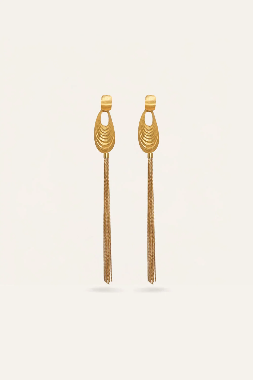 The shell and mussel stud earrings are designed to embody the beauty of the sea. Featuring removable chain tassels, they transition effortlessly from minimal to bold styling. A symbol of protection, resilience, and our deep connection to nature. Product Details: Closure: Post Fastening Composition: 100% Metal Brass Golding Fabrication: Metal Brass Golding Earring Color: Gold Made in Colombia Dimensions: Width: 0.98'', Height: 7.09''