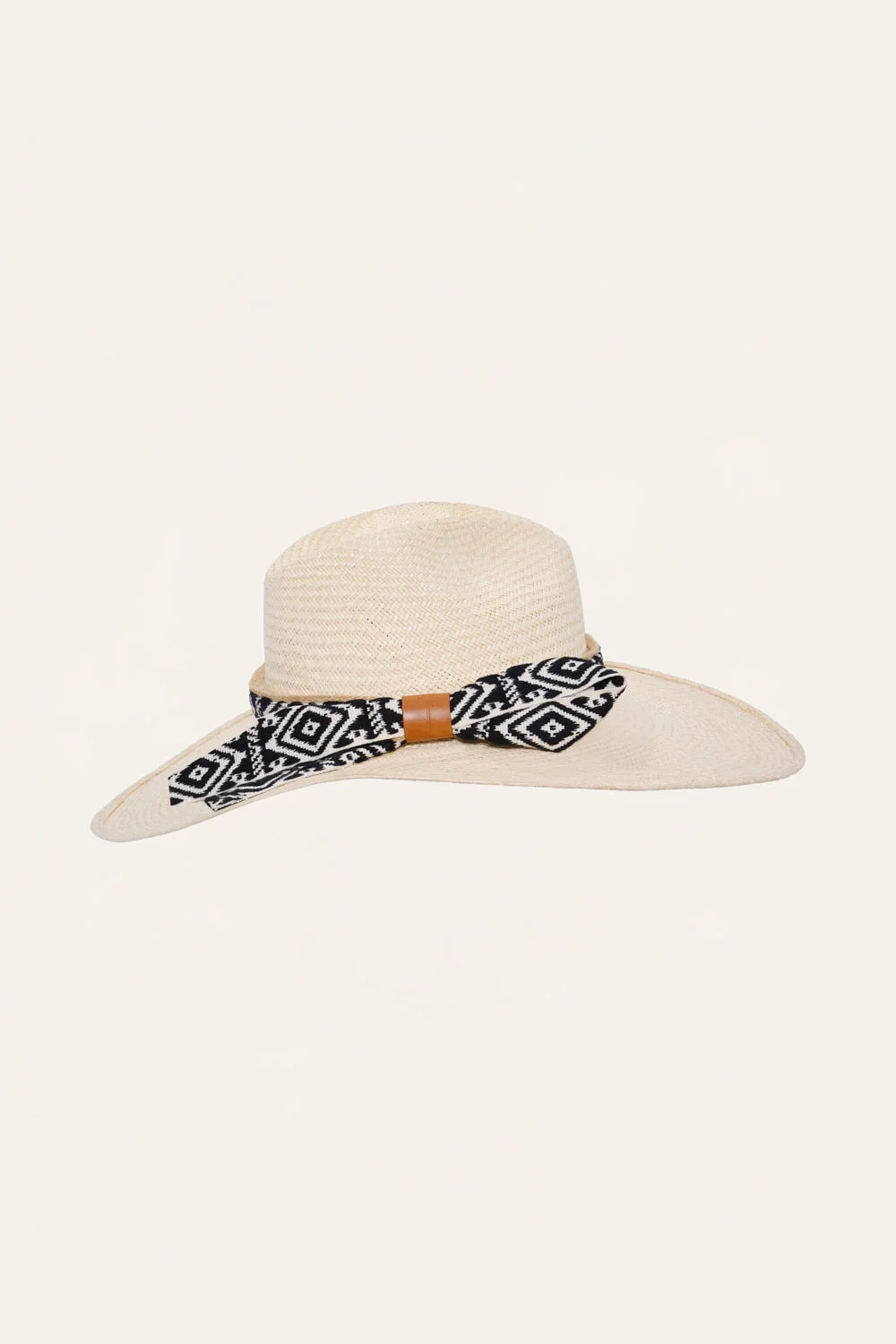A wide-brim hat handwoven from Iraca palm, showcasing artisanal craftsmanship in a timeless silhouette. Designed to offer both sun protection and style, it serves as the perfect finishing touch for resort escapes and everyday elegance. Product Details: Hand Woven Closure: Put On Composition: 85% Natural Fiber (Iraca Palm), 10% Polyester, 5% Leather Fabrication: Iraca Palm, Polyester And Leather Hat Color: Ecru/Black Made in Colombia Dimensions: Brim 4.53'', Crown Height 3.94''