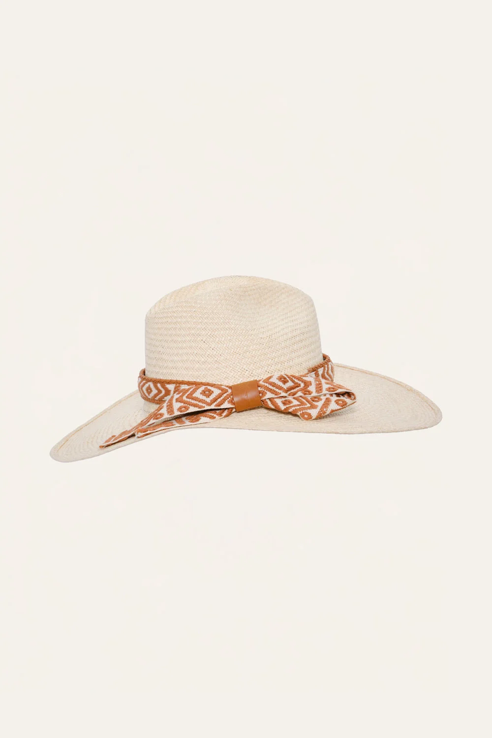 A wide-brim hat handwoven from Iraca palm, showcasing artisanal craftsmanship in a timeless silhouette. Designed to offer both sun protection and style, it serves as the perfect finishing touch for resort escapes and everyday elegance. Product Details: Hand Woven Closure: Put On Composition: 85% Natural Fiber (Iraca Palm), 5% Polyester, 5% Cotton, 5% Cow Leather Fabrication: Iraca Palm, Polyester And Leather Hat Color: Ecru/Rust Made in Colombia Dimensions: Brim 4.53'', Crown Height 3.94''