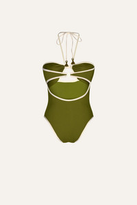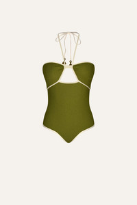 A one-piece featuring a keyhole detail and an adjustable tie fastening at the neck. Its refined silhouette offers both support and versatility, making it a standout piece for resort wear. Finished with embroidered tassels for an artisanal touch. Size and Fit: - True to size. - Adjustable tie fastening at the neck. - Please refer to our size chart for detailed guidance. Product Details: Closure: Tie Fastening Composition: 88% Recycled Polyamide, 12% Elastane Fabrication: Crinkle Lycra Color: Maguey Green/Ecru Made in Colombia