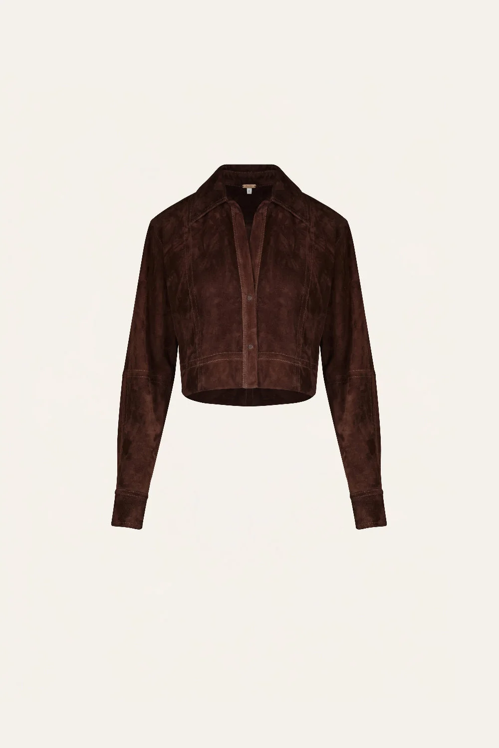 A tailored shirt in soft leather with tonal stitching, pointed collar, and snap-button closure. Wear tucked into high-waisted pieces or open over a tank. A structured staple for day or evening. Size and Fit: True to size. Designed for a slim fit. Please refer to our size chart for detailed guidance. Product Details: Closure: Front Buttons Composition: 100% Goat Leather Fabrication: Leather Color: Chocolate Made in Colombia