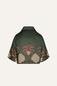 A lightweight linen shirt adorned with the iconic Johanna Ortiz palm tree print. Earthy tones blend with intricate geometric accents. Relaxed silhouette with a soft structure. Perfect over swimwear or paired with high-waisted separates. Size and Fit: - Boxy fit. - Cropped. - Please refer to our size chart for detailed guidance. Product Details: Closure: Front Buttons Composition: 100% Linen Fabrication: Light Linen Color: Green/Chocolate/Pink Made in Colombia