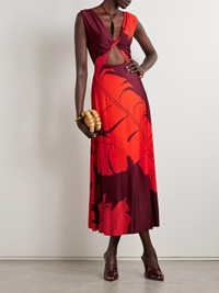 Johanna Ortiz's 'Deep Heart' midi dress is printed with vibrant crimson palm leaves that pop against the burgundy backdrop. It's from smooth stretch-jersey and has a cutout beneath the twisted bust.
