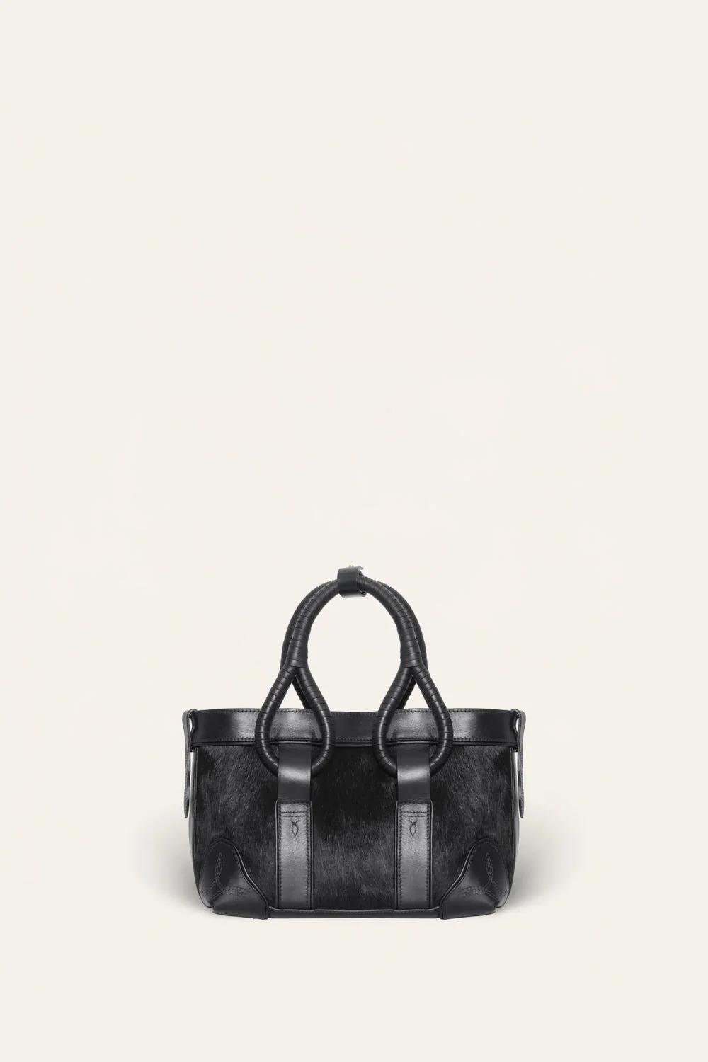 Defined by its sculptural silhouette and topstitched handles, this mini tote introduces texture and structure in one polished design. A detachable strap lets you go hands-free, while its compact shape makes it the perfect companion for city days and evening plans alike. Product Details: Closure: Open Top With Button Loop Fastening Composition: 100% Cow Leather Fabrication: Cow Leather Tote Bag Color: Royal Black Made in Colombia Dimensions: Length 12.6'', Width 6.3'', Height 7.09'', Drop 5.51''