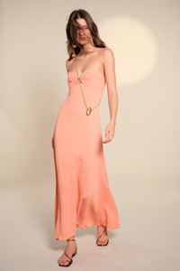 Silk ankle dress with delicate straps and a softly draped neckline. The timeless silhouette and open neckline evoke understated elegance, while the fluid finish lends itself to effortless accessorizing for both day and evening occasions. Size and Fit: - True to size. - Please refer to our size chart for detailed guidance. Product Details: Closure: Back Zipper Composition: 89% Viscose, 11% Polyamide Fabrication: Crinkle Viscose Color: Peach Made in Colombia Dimensions: Length 37.4''