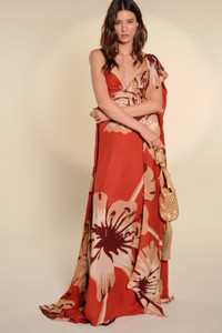A sleeveless dress in 100% silk, featuring a deep V-neckline and a flowy silhouette adorned with a beautiful floral print. Its elegant design and fluid movement make it perfect for an evening out or special occasion. Comes with a matching scarf for added styling versatility. Size and Fit: - True to size. - Please refer to our size chart for detailed guidance. Product Details: Closure: Back Zipper Composition: 100% Silk Fabrication: Silk Double Georgette Color: Red/Light Pink/Wine/Ecru Made in Colombia Dimensions: Length 45.28''