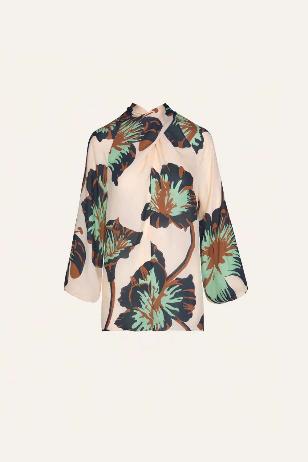Silk georgette top with a relaxed silhouette and softly gathered neckline that ties at the back. The lightweight drape of the fabric allows the floral motif to take center stage, while the keyhole detail at the back adds subtle dimension. Tuck it into the matching skirt or tailored separates to balance structure and movement. Size and Fit: - Designed with a loose fit. - Please refer to our size chart for detailed guidance. Product Details: Closure: Tie At Back Composition: 100% Silk Fabrication: Silk Double Georgette Color: Ecru/Rust/Green/Mint Made in Colombia