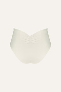 High-waisted bikini bottoms in ecru, featuring a gathered ring detail at the side. These sleek Lycra bottoms offer a flattering silhouette and pair perfectly with matching or contrasting bikini tops for a versatile beach-ready look. Size and Fit: Designed for a slim fit. Please refer to our size chart for detailed measurements and guidance. Product Details: Closure: Slip On Composition: 80% Polyamide, 20% Elastane Fabrication: Lycra Color: Ecru Made in Colombia